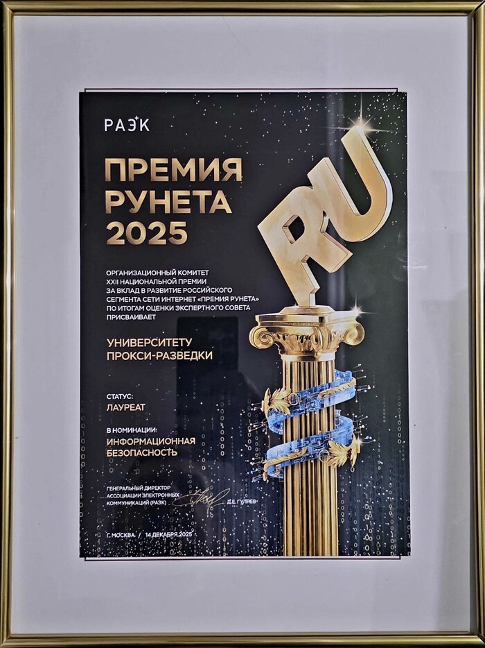 "Университет Прокси-разведки" стал Лауреатом "Премии РУнета 2025" в номинации "Информационная безопасность".